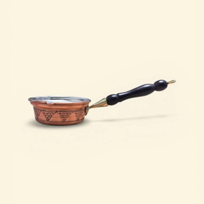 Добавете доза професионализъм и класическа елегантност към кулинарните си приключения с тази ръчно изработена медна сосиера от Газиантеп. Проектирана за прецизност и стил, тя е идеалният инструмент за приготвяне на сосове, разтапяне на масло или сервиране на гурме добавки директно на масата.